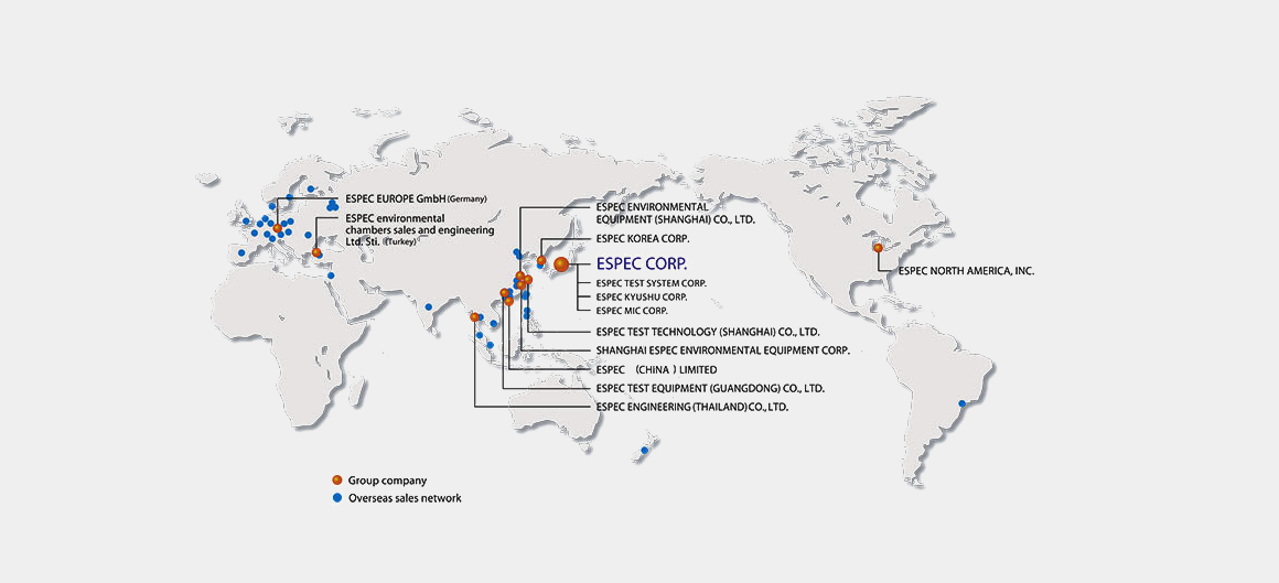 ESPEC's worldwide network comprises overseas production plants in China (Shanghai and Guangdong), the U.S. (Michigan and Colorado), and Korea,sales and service operations,and international sales agents. This network ensures thta ESPES provides worldwide products and after-sales service of the highest quality.