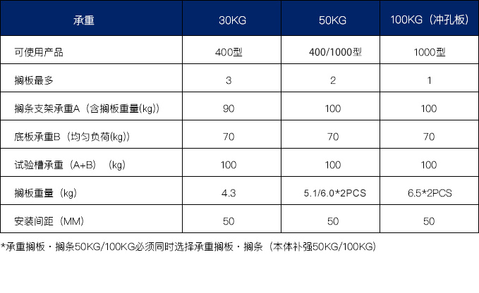選擇承重擱闆・擱條(50KG)時必須搭配使用承重擱闆・擱條(本體補強50KG);選擇承重擱闆・擱條(100KG)時必須搭配使用承重擱闆・擱條(本體補強100KG);